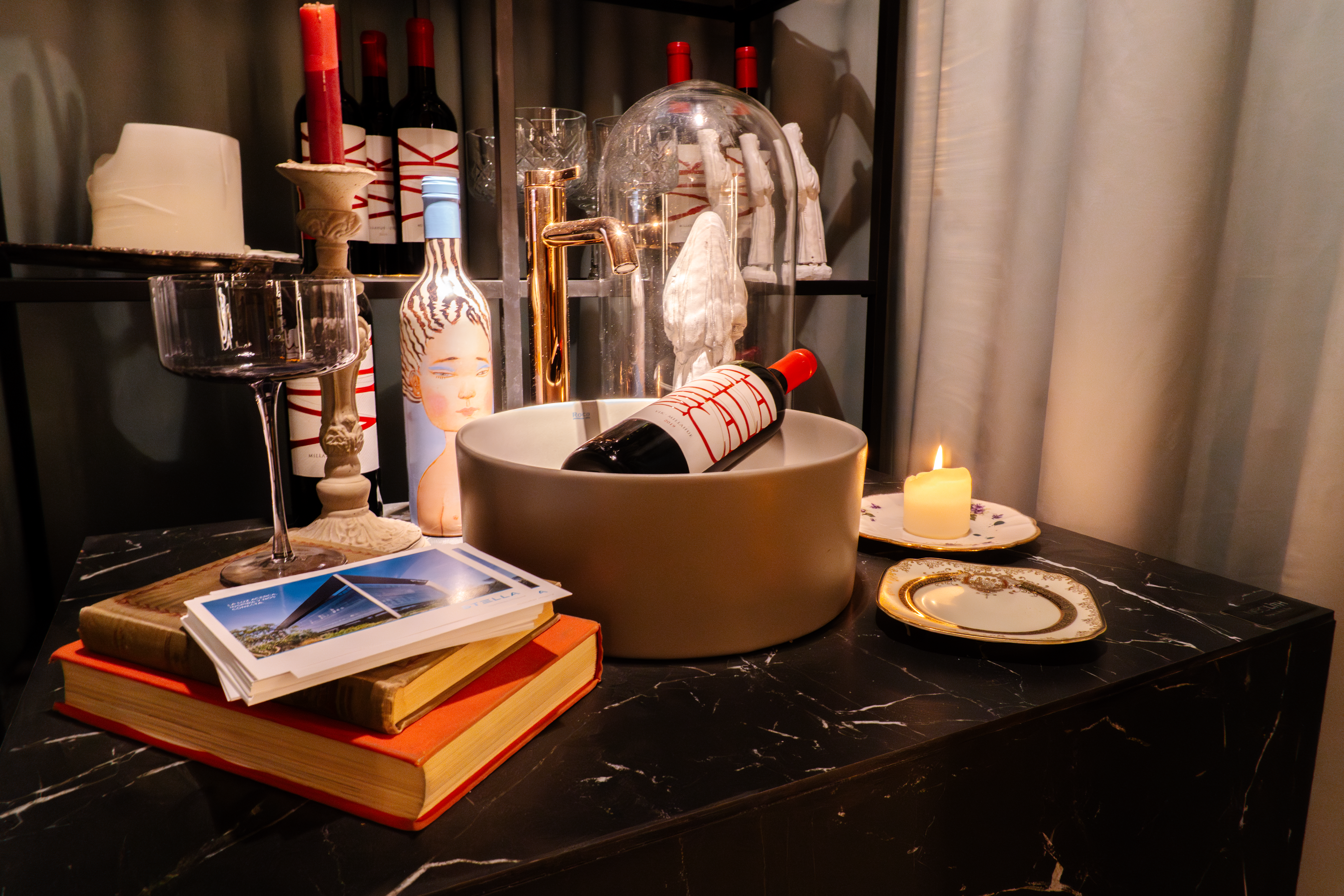 El material se utilizó tanto en las cubiertas del altar-bar como en la zona del lavamanos, funcionando como un elemento unificador que otorga continuidad, resistencia y una estética limpia, perfecta para un espacio ritual reinterpretado.