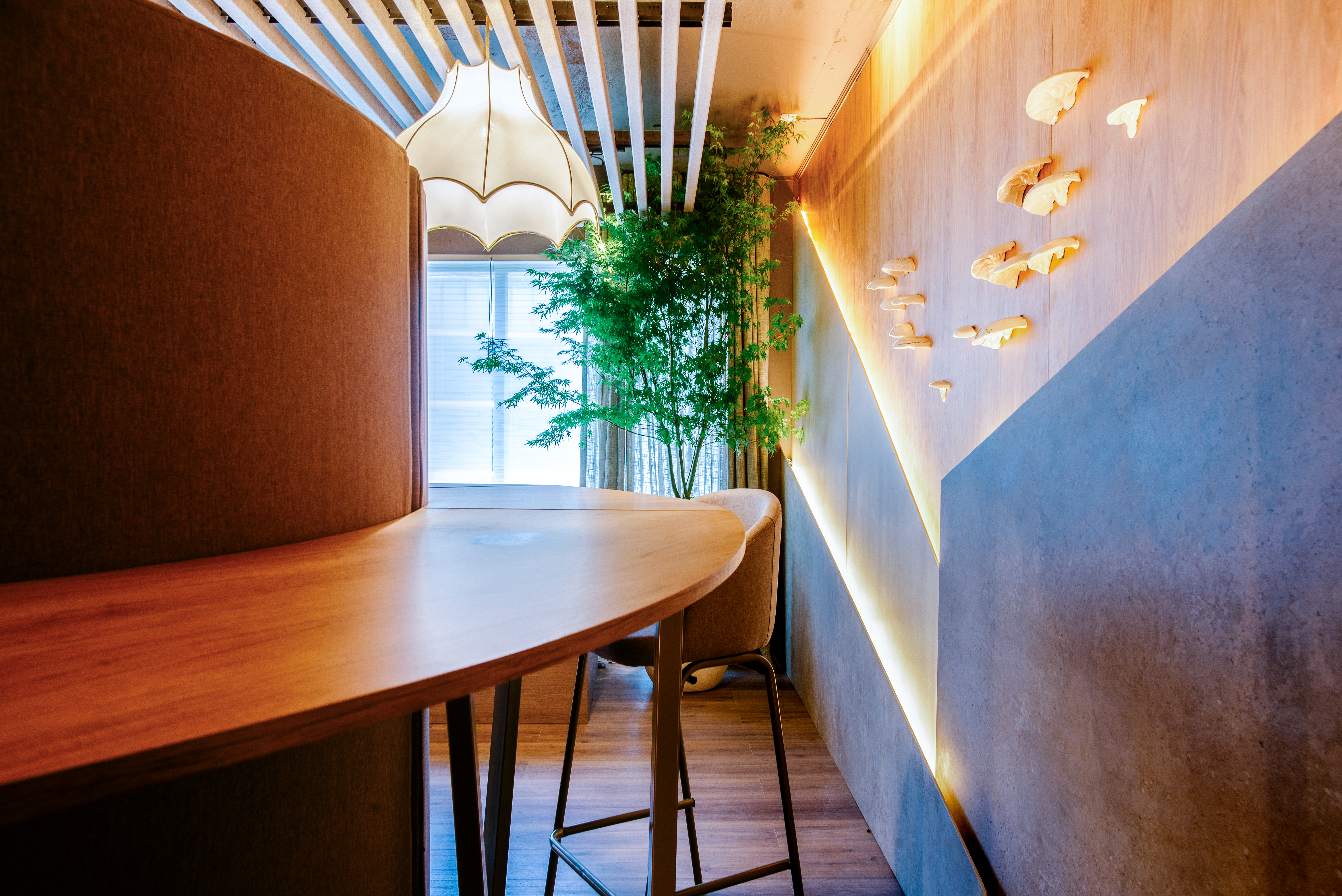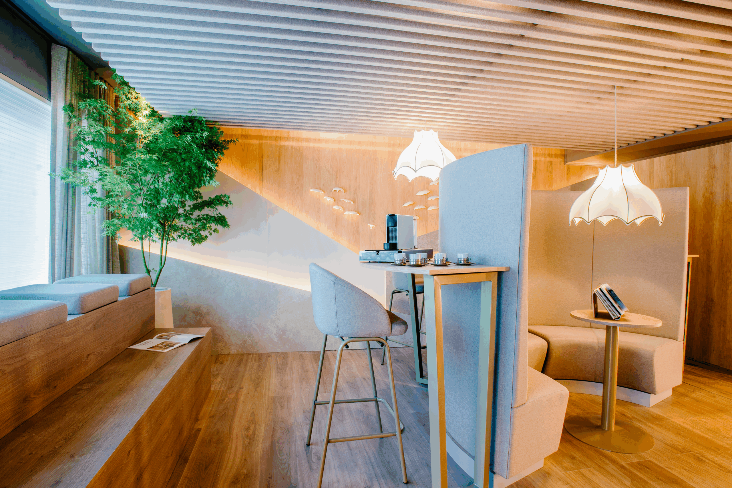Para este espacio de coworking quisimos demostrar que incluso en un área pequeña es posible generar varios ambientes: uno colaborativo, otros más independientes y zonas que conviven en perfecta armonía. Nos inspiramos en el sur de Chile, en esa sensación de calma y refugio que transmite su naturaleza. Trabajamos una paleta de colores cálida y materiales que aportaran confort, con el objetivo de crear un espacio muy humanizado, acogedor y cercano, donde las personas se sintieran realmente a gusto.